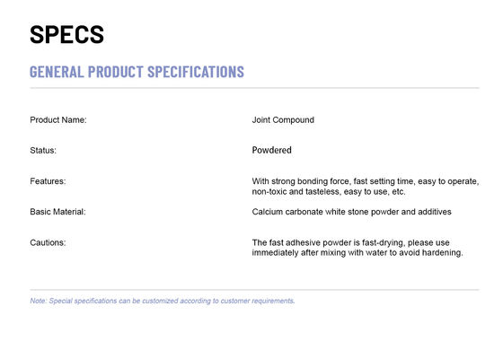 Fuging Compound jest białym proszkiem, mieszanym z wodą, używanym do szpachlowania ścian i sufitów.Jest również często stosowany jako alternatywa dla tradycyjnego tynkowania do wykańczania spoin, narożników, listew i elementów złącznych.Zasadniczo Joint Compound może pomóc ukryć szwy wzdłuż ścian, pozostawiając je gotowe do malowania.